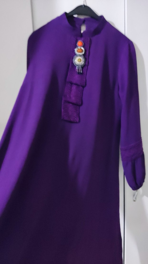 Uzun mor tunik, yakasında kesik yaka ve düğmeli ön kısmında işlemeler bulunur. Bol kesim ve ipeksi dokusuyla günlük kullanıma uygundur.