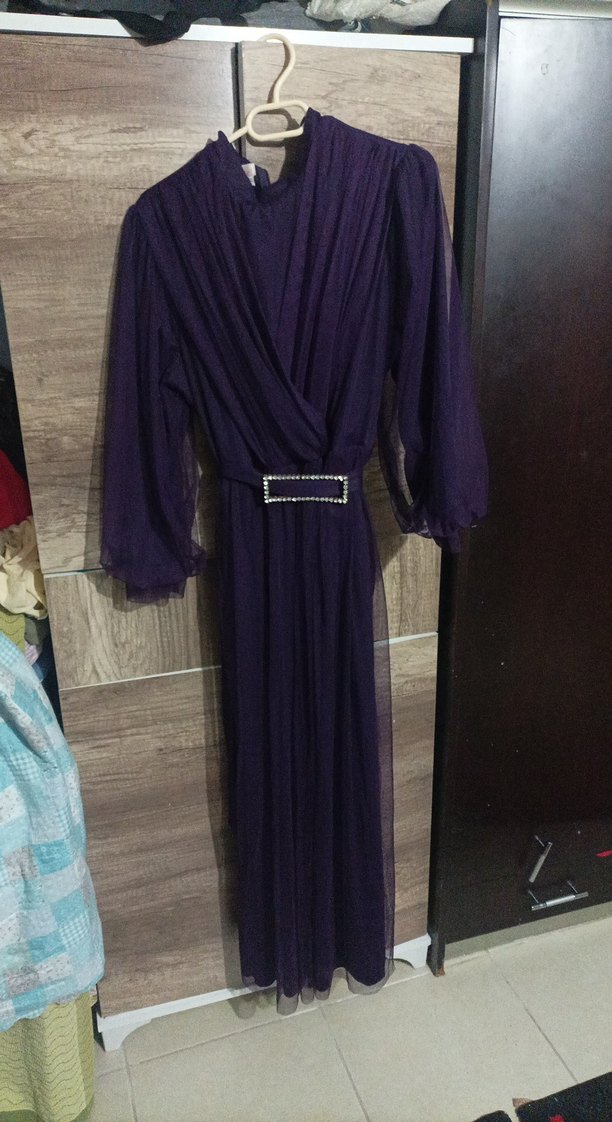 Mor renkte, uzun kollu ve V yakalı, salaş kesim vintage tarzda uzun abiye elbise, drapeli ve kemer detaylı, düğünler için uygun.