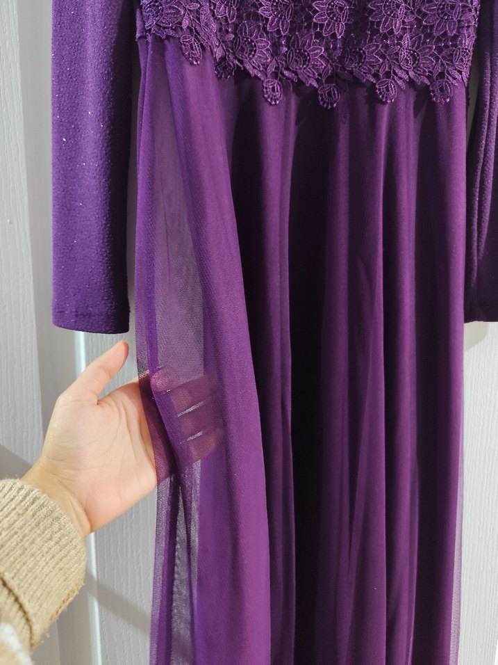 Mor renkte, uzun kollu ve crew yaka olan bu abiye elbise, beli çiçek dantelli ve drapeli detaylara sahiptir. Gotik tarzda, düğün için uygundur.