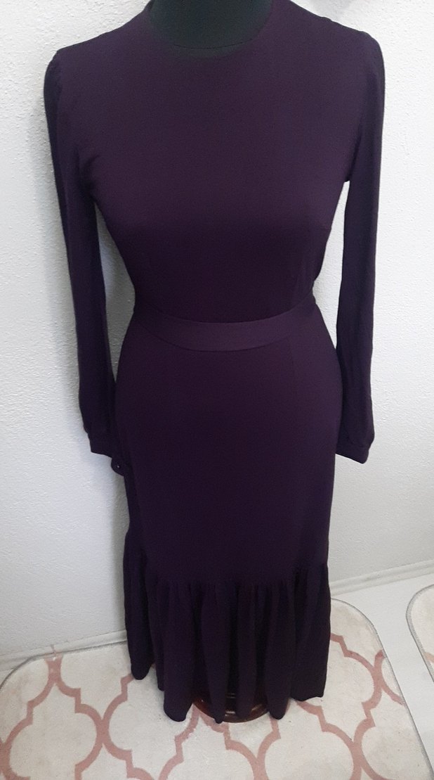 38 beden Bu mor, uzun kollu ve etek ucundaki fırfır detayı ile şık bir görünüme sahiptir. Yumuşak ince penye kumaştan üretilmiştir. boyu omuzdn 142 cm arka ortadan fermuarli