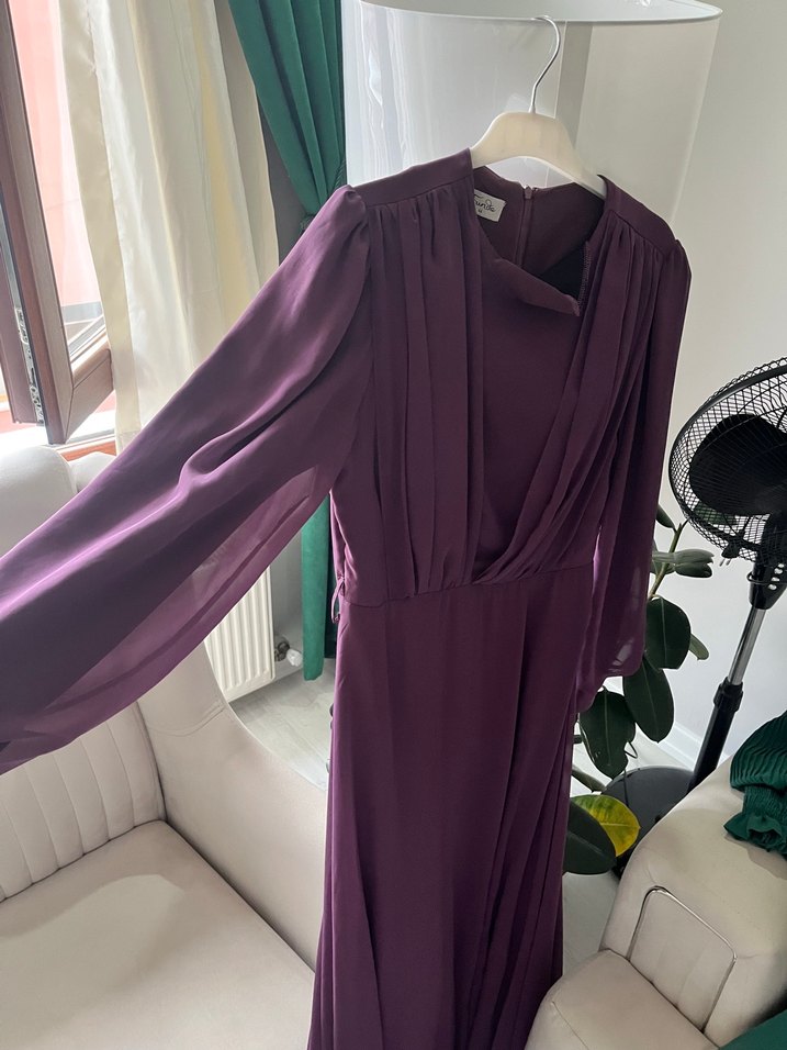 Mor renkli, uzun kollu, V yakalı ve drapeli tasarıma sahip uzun elbise. İpek gibi kumaştan üretilmiş, salaş kesimiyle ofis için uygundur. annemin boyu 1.72 kilosu 69 2 kere falan giydi
