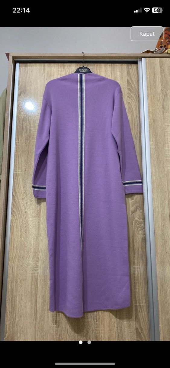 Mor pastel renkte, uzun kollu ve regular fit kadın elbise. Minimalist tarzda, sırtında dikey şerit detayı bulunur.