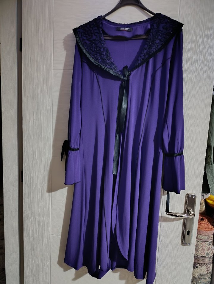 Mor renkte, uzun kollu ve bol kesim kadın elbisesi. Yakasında siyah dantel ve kurdele detayları bulunur.
