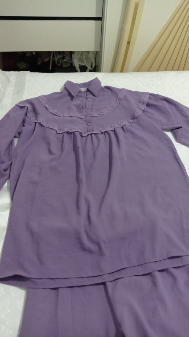 Pastel mor renkli, uzun kollu ve yakalı, dantel detaylı, bol kesim tesettür takim