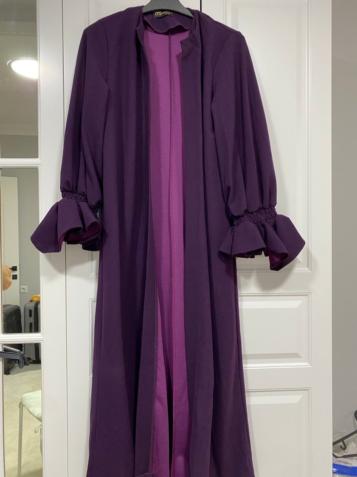Kadınlar için uzun kollu, bol kesim ve modern klasik tarzda koyu mor renkte sade ve desen içermeyen uzun elbise. Kap veya pardesü olacakta kullanılır kendi kumaşından kemeride vardır geniş kesim büyük bedene ıygundur Ürün omuzdan boy 1.30 cmdir