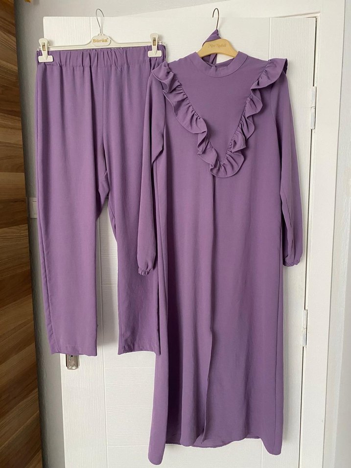 Pastel mor renkte, uzun kollu ve fırfır detaylı, bol kesim minimalist kadın pijama takımı.