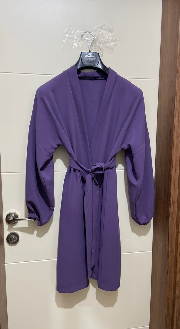 Kadınlar için uzun kollu, regular fit mor sabahlık. Minimalist ve çağdaş tarzda, desensiz ve belden bağlamalıdır.