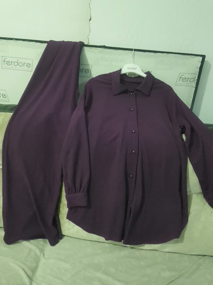 Mor renkte, uzun kollu ve klasik polo yakalı kadın takım gömlek ve pantolon , yumuşak ve tiril tiril bürümcük kumaştan üretilmiştir, ofis kullanımına uygundur. özel dikim etiketi yok bedeni uymadığından satıyorum 42 bedene kadar uyar