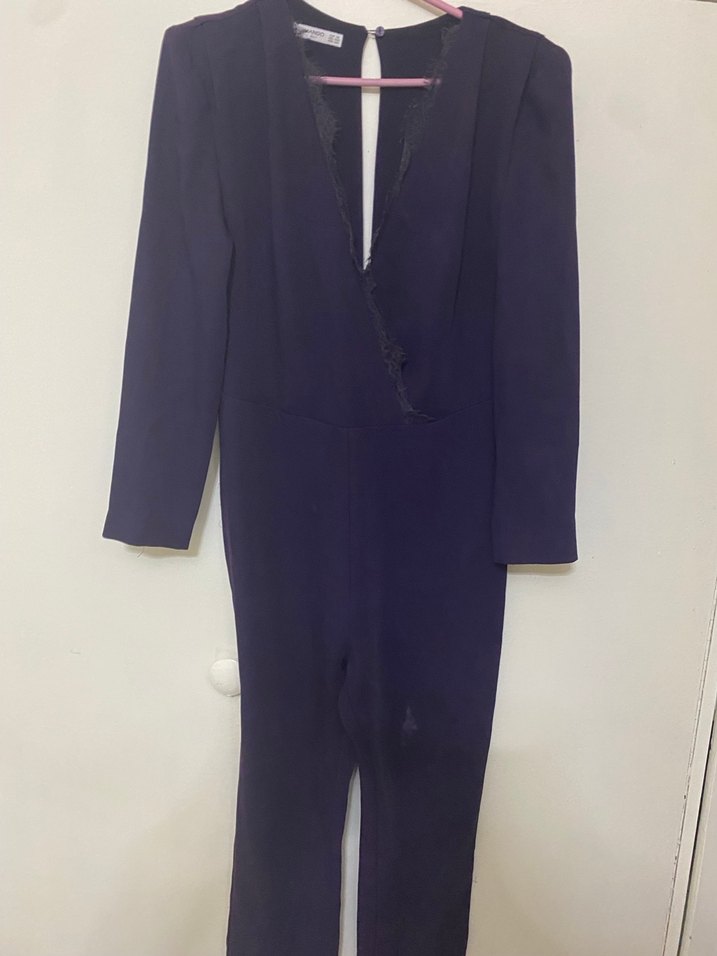 Mor renkli, uzun kollu kadın tulumu, yakalı ve sade desenli. İpek gibi kumaştan, ofis için şık ve rahat bir seçim. ✨