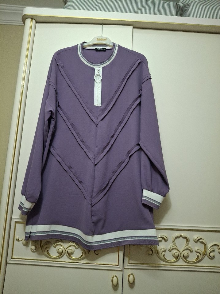 Mor renkli, uzun kollu, düğmeli ve yuvarlak yakalı kadın tunik. Rahat, bol kesim ve kısa boyda, yumuşak sentetik kumaştan üretilmiştir. Günlük kullanıma uygundur.