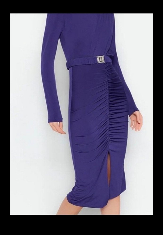 Mor renkte, uzun kollu ve V yakalı dar kesim elbise, kemerli ve ön kısmı büzgülü. Ofis için çağdaş ve göz alıcı bir tarz sunar.