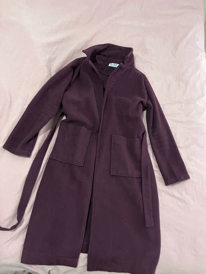 Mor renkli, yumuşak ve sıcak kumaştan uzun kadın kabanı. Notlu yaka, kemer ve uzun kollu, rahat kesimle günlük kullanıma uygun.