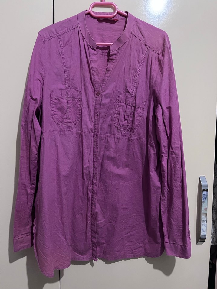 Mor keten gömlek, uzun kollu ve düğmeli. Normal midi boyda, yakalı ve salaş kesim. Günlük rahat stil için uygundur.
