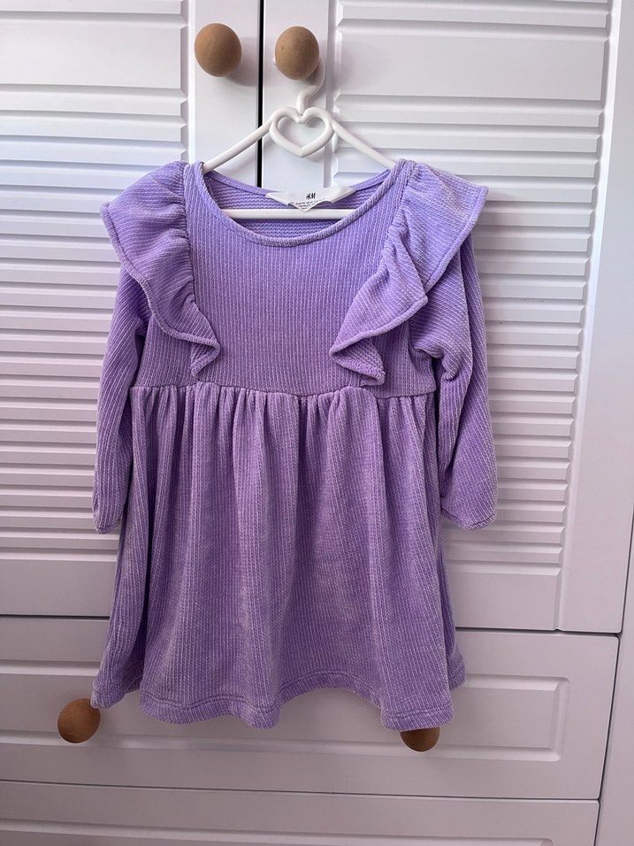 Mor renk, uzun kollu, triko kumaştan, bol kesim kız çocuk elbisesi. Fırfır detayları ve yuvarlak yaka bulunur. Bohem tarzına uygun, yumuşak pastel ton.