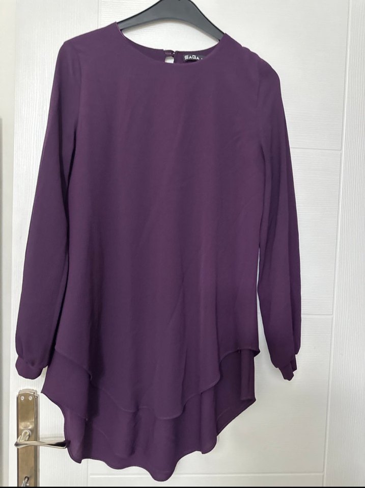 Kadınlar için mor, uzun kollu, bol kesim ve dökümlü midi tunik. İpek gibi kumaştan, yuvarlak yakalı ve sade, günlük kullanıma uygun.