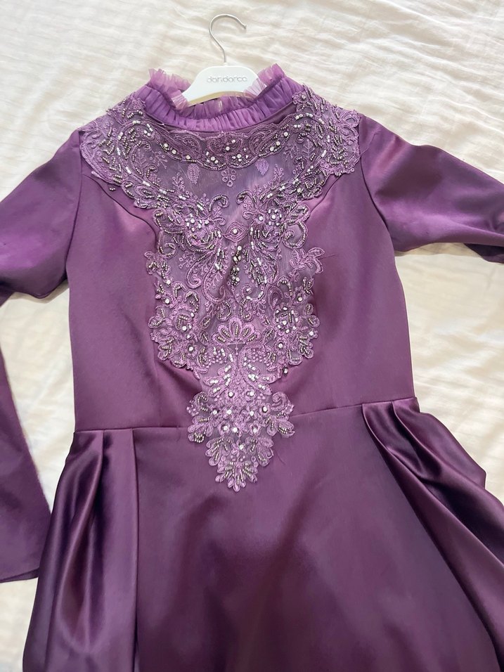 Mor, uzun kollu ve yüksek yakalı bu dar kesim abiye elbise, göğüs kısmında drapeli ve işlemeli detaylara sahip, parlak ve vintage esintili bir tasarımdır.