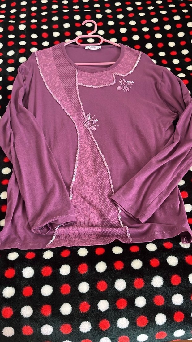 Mor renkli, uzun kollu, yuvarlak yakalı, nakış ve dantel detaylı, bol kesim bohem tarzda bluz. Günlük kullanıma uygundur.