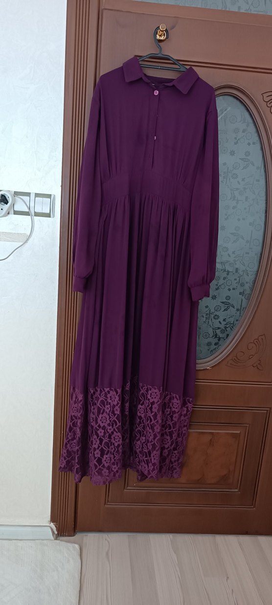 Bol kesim, koyu mor uzun elbise, uzun kollu, yuvarlak yaka ve nakış detaylarıyla, drapeli kumaştan yapılmıştır, düğünler için uygundur. emzirme için falan önü dugmelidir