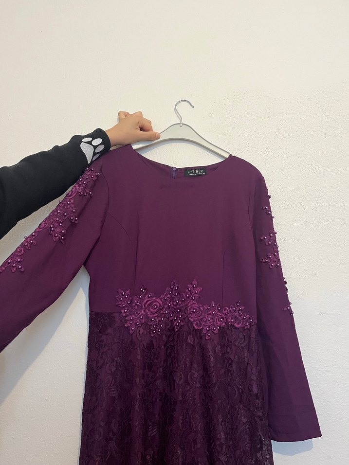 Mor renkli, uzun kollu, dantelli ve nakışlı bu dar kesim elbise, sade ve mütevazı tarzı ile düğünler için uygundur.