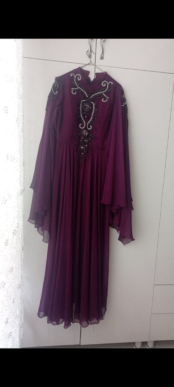 Bu mor uzun abiye elbise, drapeli uzun kollara ve V yakaya sahiptir. Ayrıntılı nakışlarla süslenmiş olup, bol kesimiyle düğünler için uygundur. Klasik ve gotik tarzı bir arada sunar.