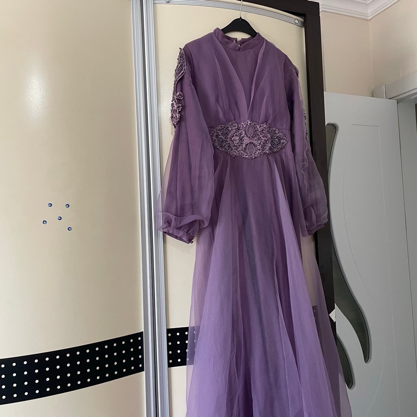 Mor Uzun Kollu Nakışlı Kadın Abiye Elbise