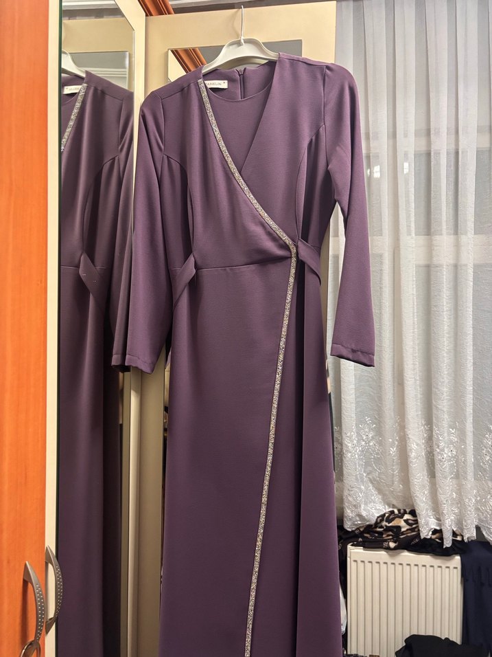 Mor, uzun boy, uzun kollu kadın elbise. Modern klasik tarzda, parlak kumaş ve kenarlarında zarif nakış detayları bulunur. Minimalist tasarım şıklık katar.
