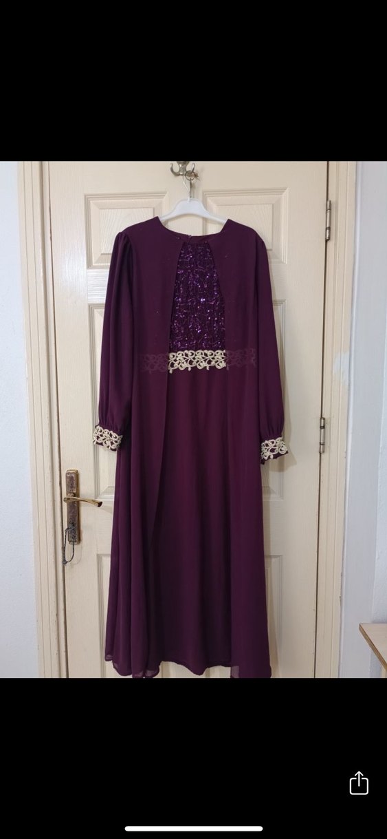 Mor renkte, yüksek yakalı ve uzun kollu, bol kesim vintage tarzda uzun elbise. Drapeli ve nakışlı detaylara sahip, sentetik kumaftan yapılmıştır. Düğünler için uygundur.