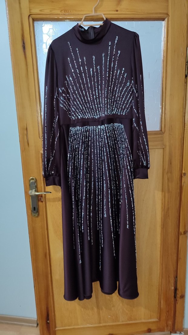Uzun kollu, yüksek yakalı mor gece elbisesi, payet işlemeleriyle avant-garde gotik tarz sunar. Rahat kesimlidir. ✨