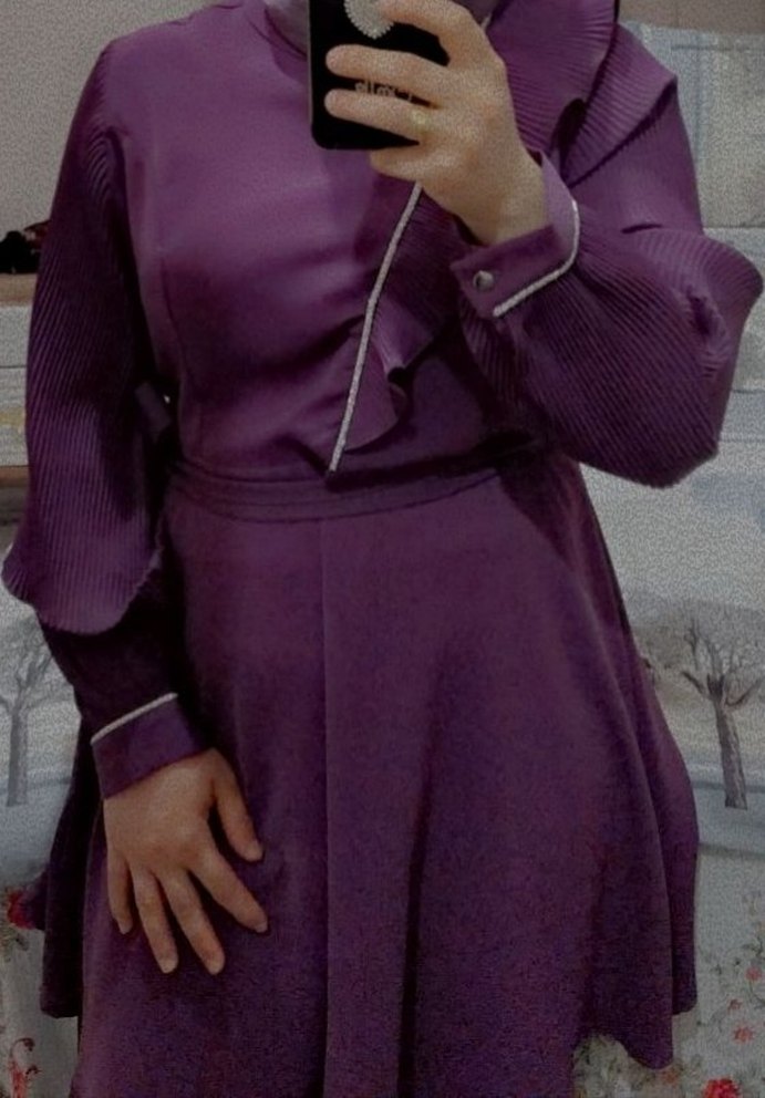 Bu koyu mor, vücuda oturan kadın takımı yüksek yakalı ve uzun pilili kollara sahiptir. Pürüzsüz sentetik kumaştan yapılmıştır. Uzun boyu ve desensiz tasarımı ofis için uygun Goth tarzı, trend günlük görünüm sağlar.