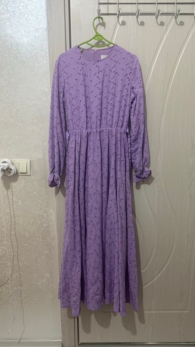 Bu uzun mor elbise, piliseli detaylar ve yuvarlak yaka ile bol kesimdir. Uzun kollu, pastel tonlarda batik desenlidir ve günlük sokak stili için uygundur.