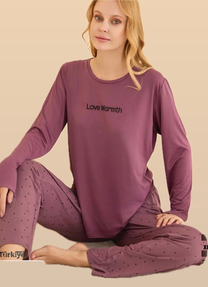 Pastel mor renkte, uzun kollu, bol kesim kadın pijama takımı. Üstte "Love Warmth" yazısı bulunur, rahat ve konforludur. #biricikicgiyim #kadıngiyim #pijama #pijamatakımı #kadınpijama #evgiyim