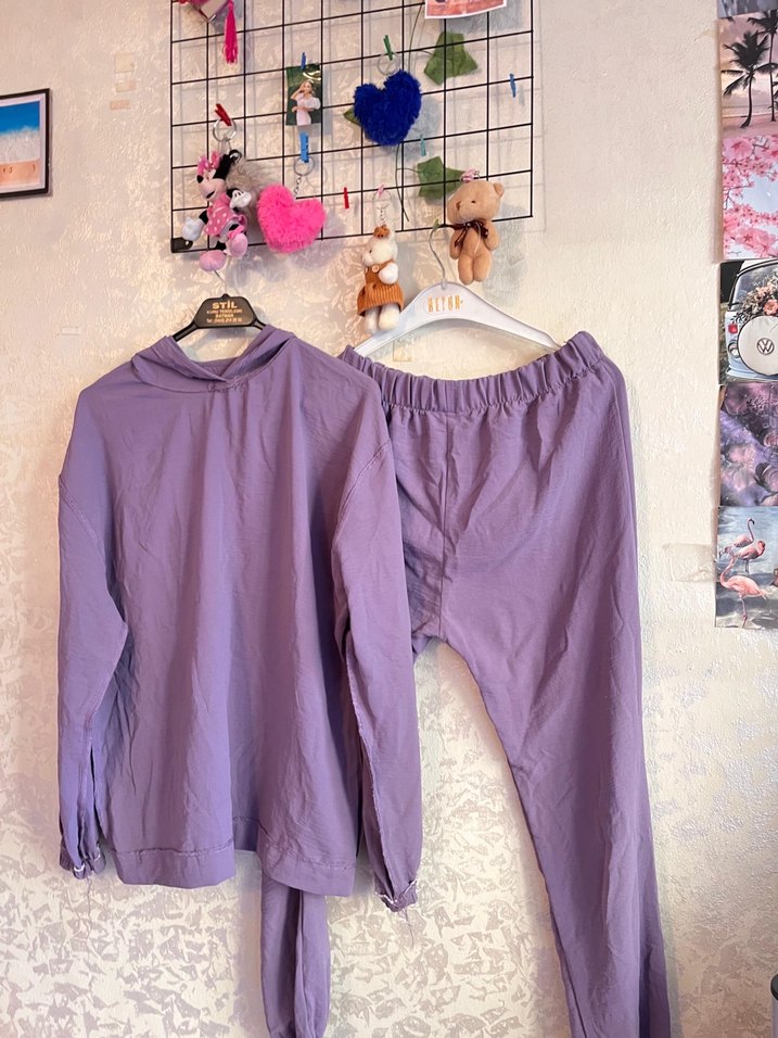 Mor renk, uzun kollu, midi boy, bol kesim pijama takımı, yumuşak kumaştan rahat ve konforlu.