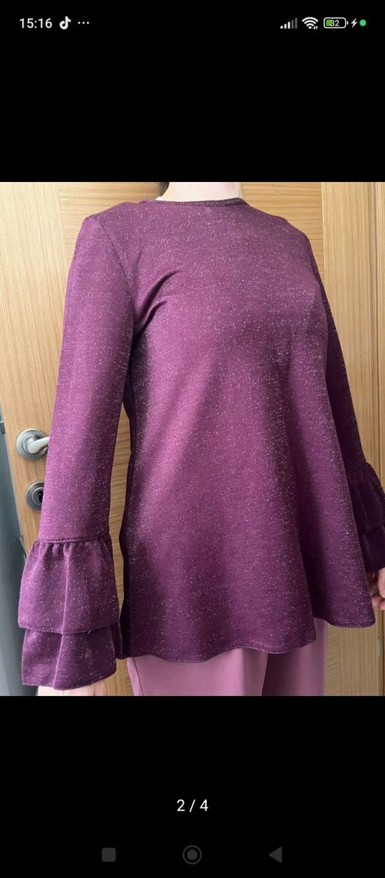 Mor uzun kollu tunik, parlak sentetik kumaş ve kol uçlarında volan detayına sahiptir. Salaş kesim, bisiklet yaka ve midi boydadır.