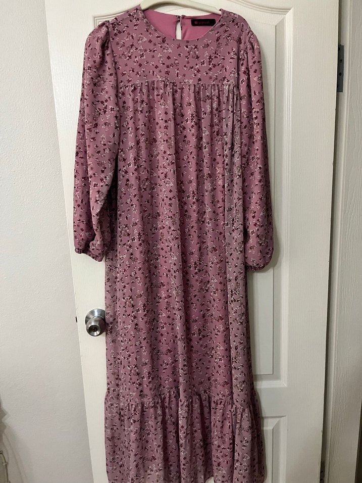 Uzun kollu, salaş kesim mor elbise, fırfır detaylı ve yuvarlak yakalı. Yumuşak sentetik kumaştan, bohem tarzını yansıtan rahat bir model.