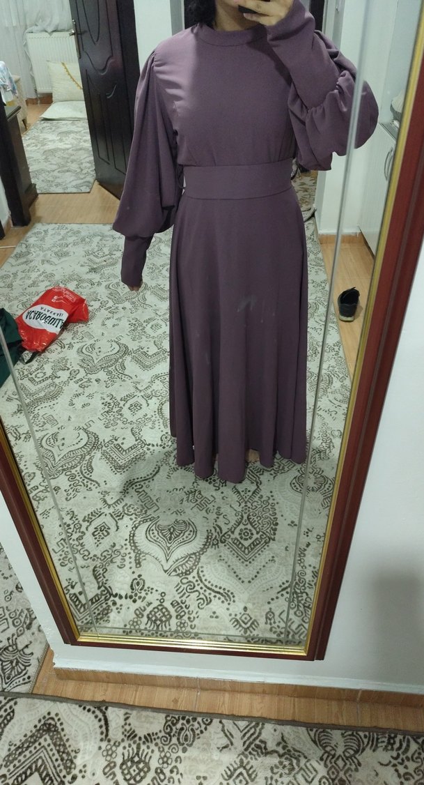 Mor renk, uzun kollu, salaş kesim ve drapeli detaylara sahip uzun elbise. Yumuşak sentetik kumaştan, sade ve muhafazakar goth tarzına uygun, düğün için ideal.