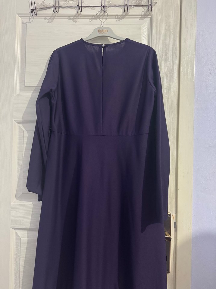 Mor uzun kollu, yuvarlak yaka, salaş kesim ve drapeli tasarıma sahip, düz sentetik kumaştan yapılmış ofis için uygun elbise.