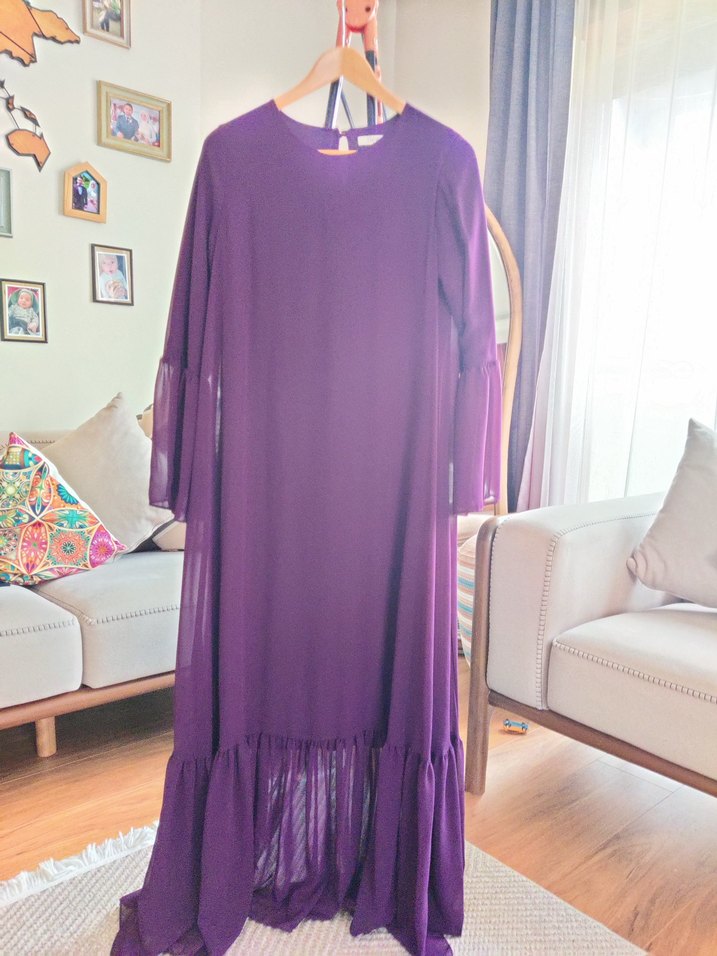Mor renkte, uzun kollu ve salaş kesimli elbise. içi astar üstü tüldür. kol ucu ve etek ucunda astar yok sadece tüldür. 2 kez giyildi hiçbir defosu yoktur