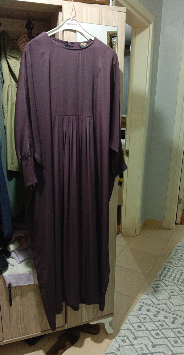 Mor renkli, uzun kollu ve yüksek yakalı, salaş kesim kadın elbisesi. İpeksi kumaştan, sade ve mütevazı tarz için uygun. ferace elbise içten belinde bağlama lastiği mevcut çok şık duruyor