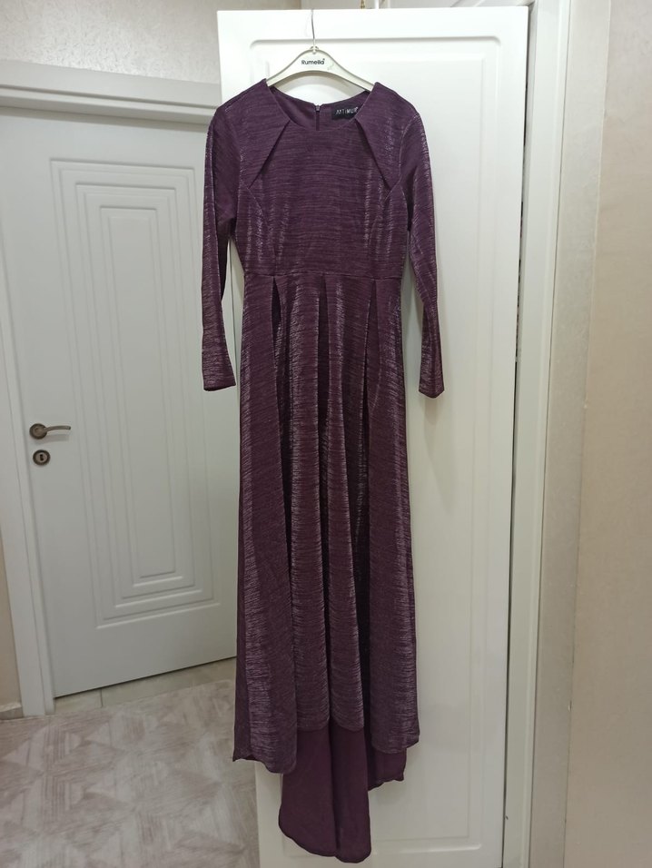 Mor uzun kollu, salaş kesim kadın elbise, sentetik yumuşak kumaştan, drapeli detaylı, yuvarlak yaka, düğün için uygun.