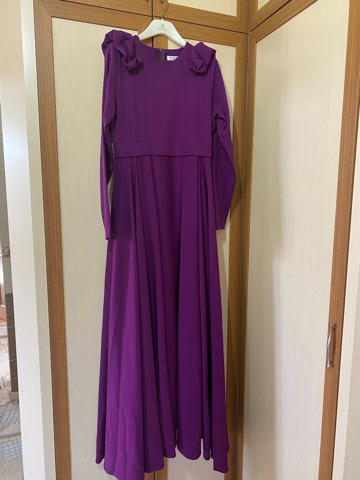 Mor uzun kollu elbise, salaş kesim ve omuzlarda drapeli detaylara sahiptir. Yumuşak sentetik kumaştan üretilmiştir.