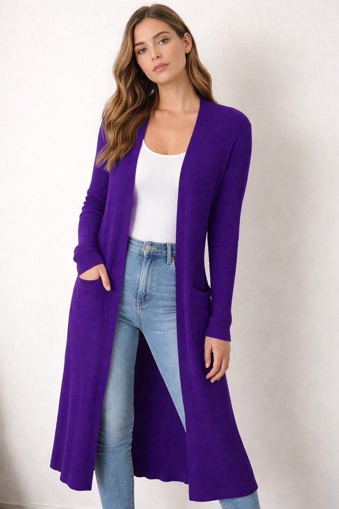Mor renkte, uzun kollu ve salaş kesimli bu uzun hırka, notlu yaka detayıyla dikkat çeker. Yumuşak ve sıcak kumaşıyla günlük kullanım için rahat ve şık bir seçimdir.