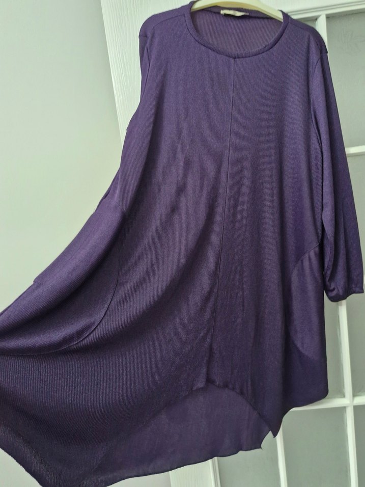 Mor renkte, uzun kollu, salaş kesim kadın tunik. İpek gibi yumuşak kumaştan, drapeli ve yuvarlak yakalıdır. Günlük kullanıma uygundur.