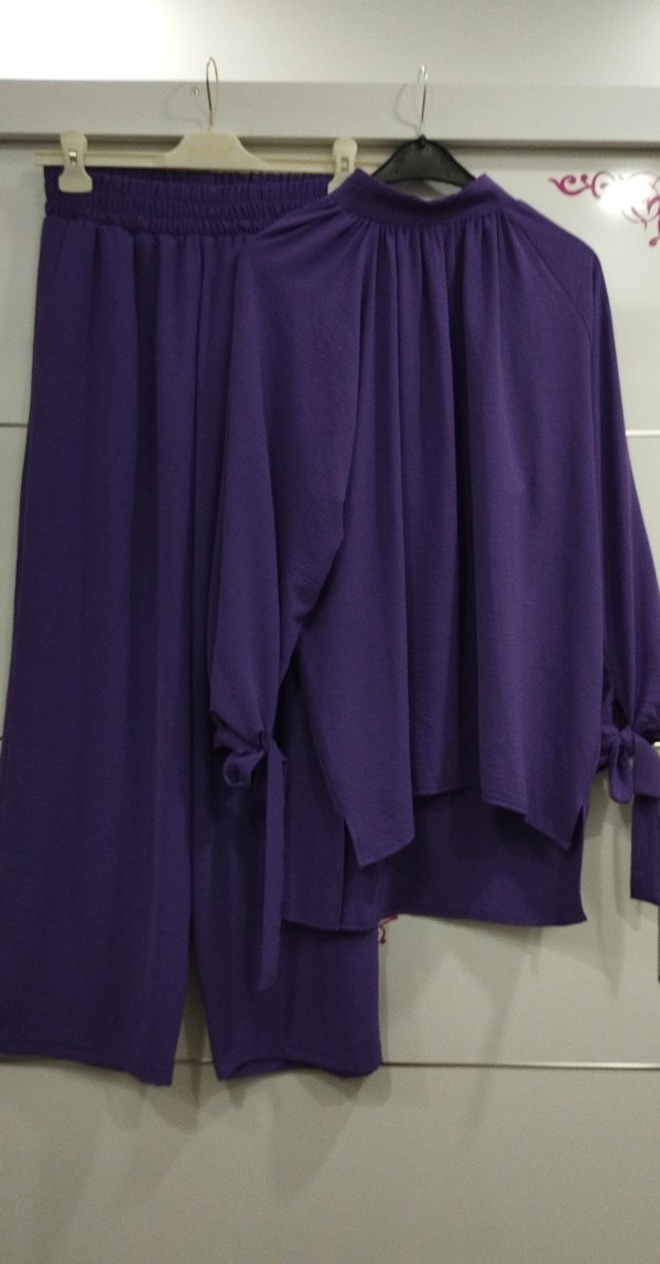 Mor renkte, uzun kollu ve salaş kesimli tunik. Yumuşak sentetik kumaştan, drapeli tasarımıyla ofise uygun. tunik önü 68 cm arkası 82 cm pantolon 100 cm