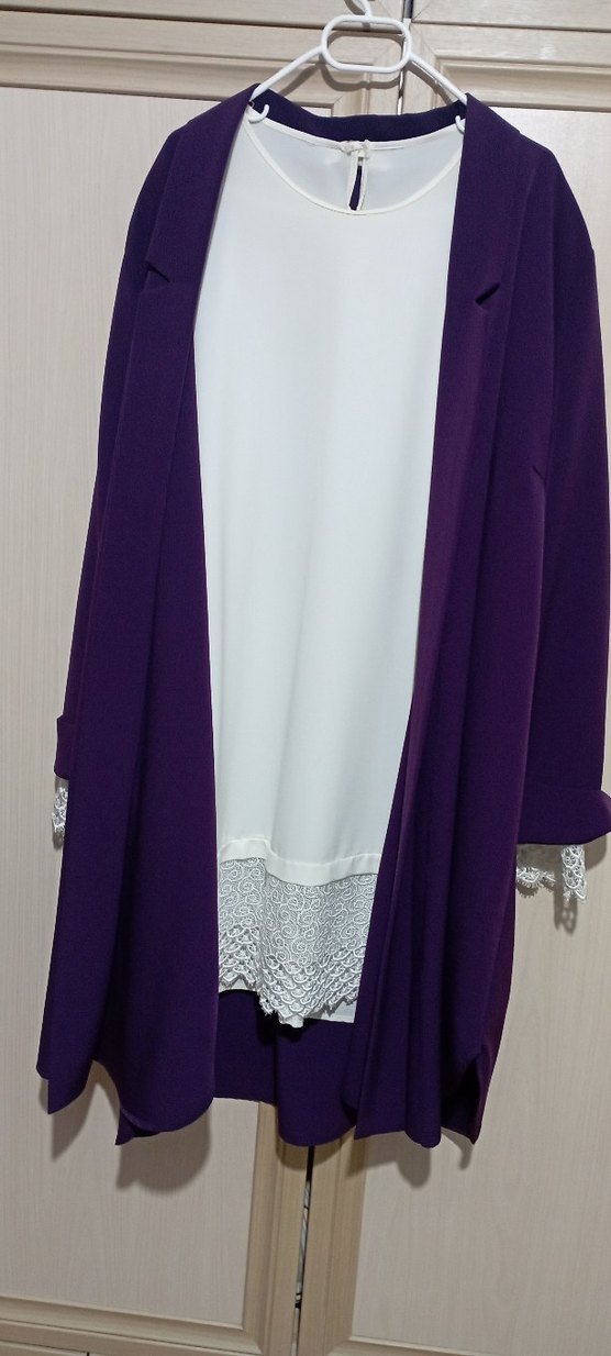 Mor renkte, yakalı ve drapeli uzun kollu salaş tunik. Sentetik kumaştan, uzun boylu ve ofis için uygun. Sadece 2 kez giyildi gömleğin kolları ve alt ucu küpürlü ceket mor gömlek beyaz etiketinde 3Xl görünüyor 52 bedene kadar olur