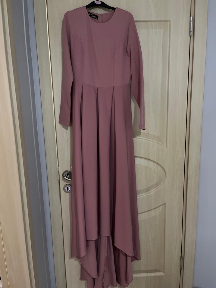 Mor renkli uzun kollu, yuvarlak yaka, sentetik kumaştan yapılmış salaş ve drapeli uzun elbise, modern klasik tarzda.