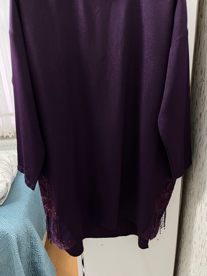 Mor renkte, uzun kollu, salaş kesim ve V yakalı kadın tunik. İpeksi kumaştan, dökümlü tasarımla rahat ve sade bir stil sunar. Günlük kullanıma uygundur.