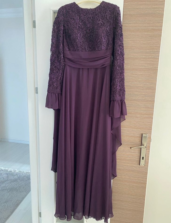 Uzun kollu ve yuvarlak yakalı, üstü dantel detaylı, etek kısmı drapeli mor uzun abiye elbise. Rahat kesimi ve modern klasik tarzıyla düğünler için uygun.
