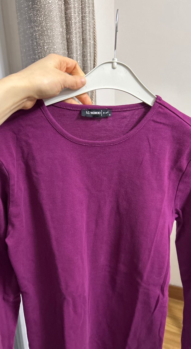 Mor renkli, uzun kollu, yuvarlak yaka ve pamuklu kumaştan yapılmış, günlük kullanım için uygun, vücuda oturan hamile tişörtü.