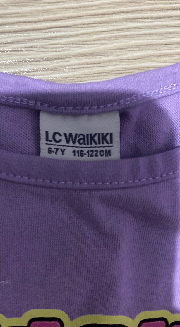 Mor renk, uzun kollu ve bisiklet yaka tişörtü. Sentetik kumaştan, baskılı desenli ve cırt cırtlı detaylıdır. LC Waikiki markalı, 6-7 yaş beden.