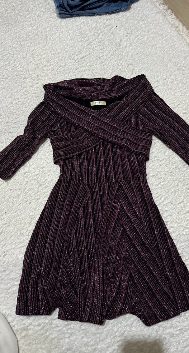 Mor uzun boy triko elbise, tek renk ve tek renk, tekne yaka ve askılı kollu, rahat ve şık parti tarzı için uygundur.